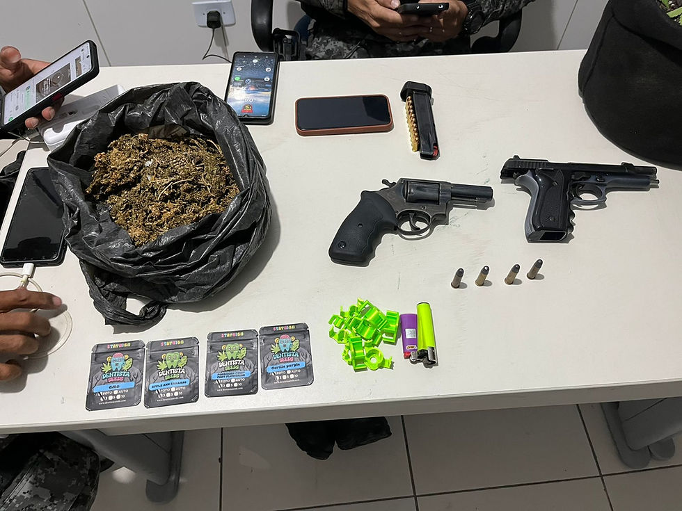 No imóvel, a PM também apreendeu um revólver calibre .38, contendo quatro munições do mesmo calibre, e uma pistola calibre .380, acompanhada de 10 munições intactas.