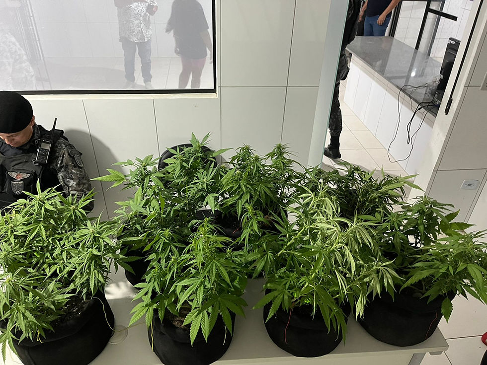 No local, dois indivíduos em atitude suspeita foram abordados. Com um deles, os policiais encontraram uma porção de substância análoga à maconha. Durante buscas no interior da residência, foram localizados ainda sete pés de maconha in natura, além de aproximadamente 220 gramas da droga já pronta para consumo.